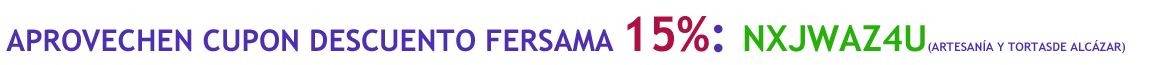 Vamos a indicar el cupón para el 15% de descuento FERSAMA, para las Tortas de Alcázar «Las Canteras» y la artesanía, recién incorporada con motivo de esta entrañable Feria que hemos disfrutado, y que hemos decidido prolongar el aprovechamiento de este cupón todo este mes de abril hasta el sábado 29 incluido: