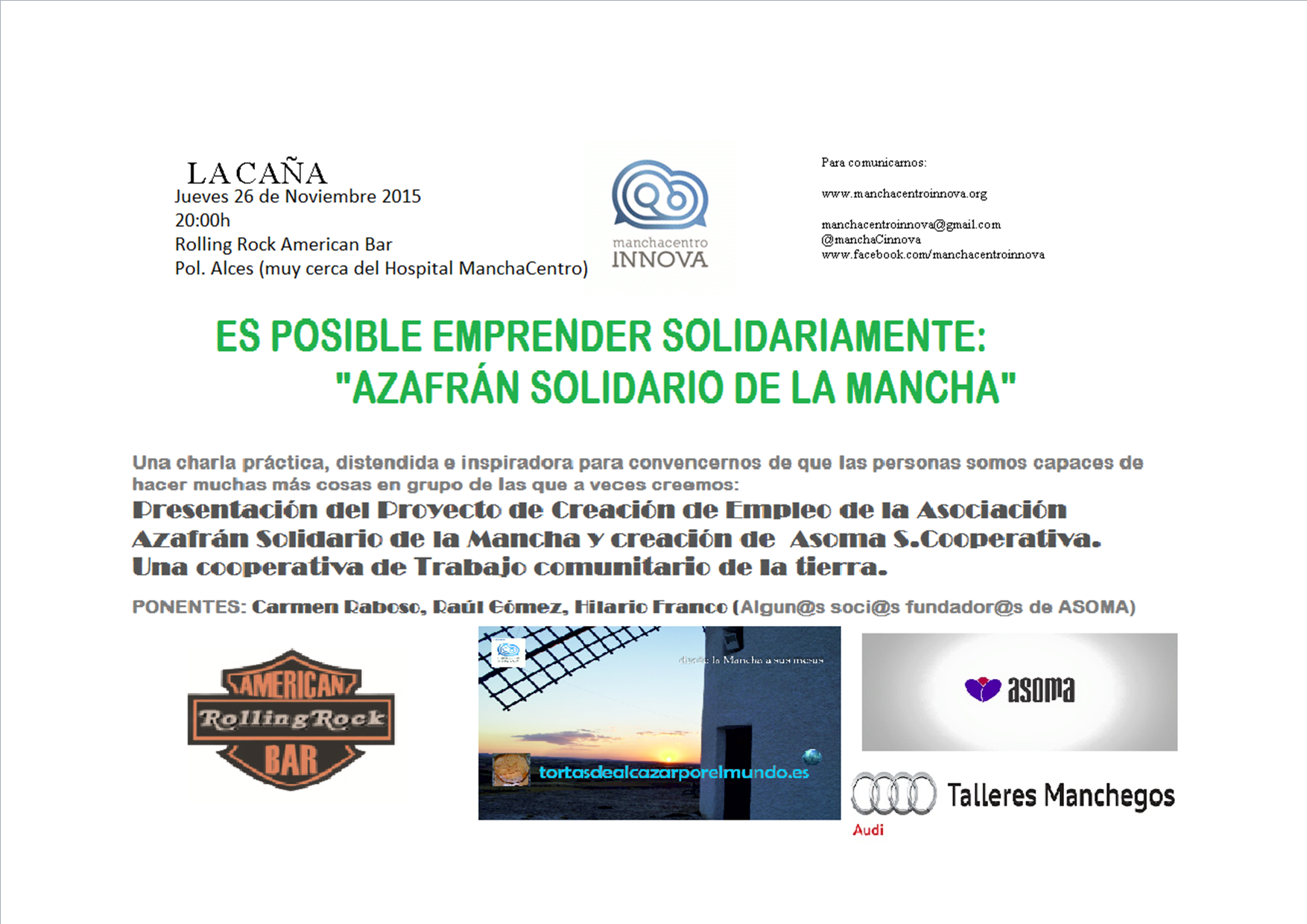 Además también adjuntamos el cartel donde aparecemos como co-promotores del encuentro/caña de Noviembre del Colectivo ManchaCentroInnova, que será el jueves 26 de noviembre y al que estais todas las personas que queráis participar animadas a hacerlo, ¿vale?